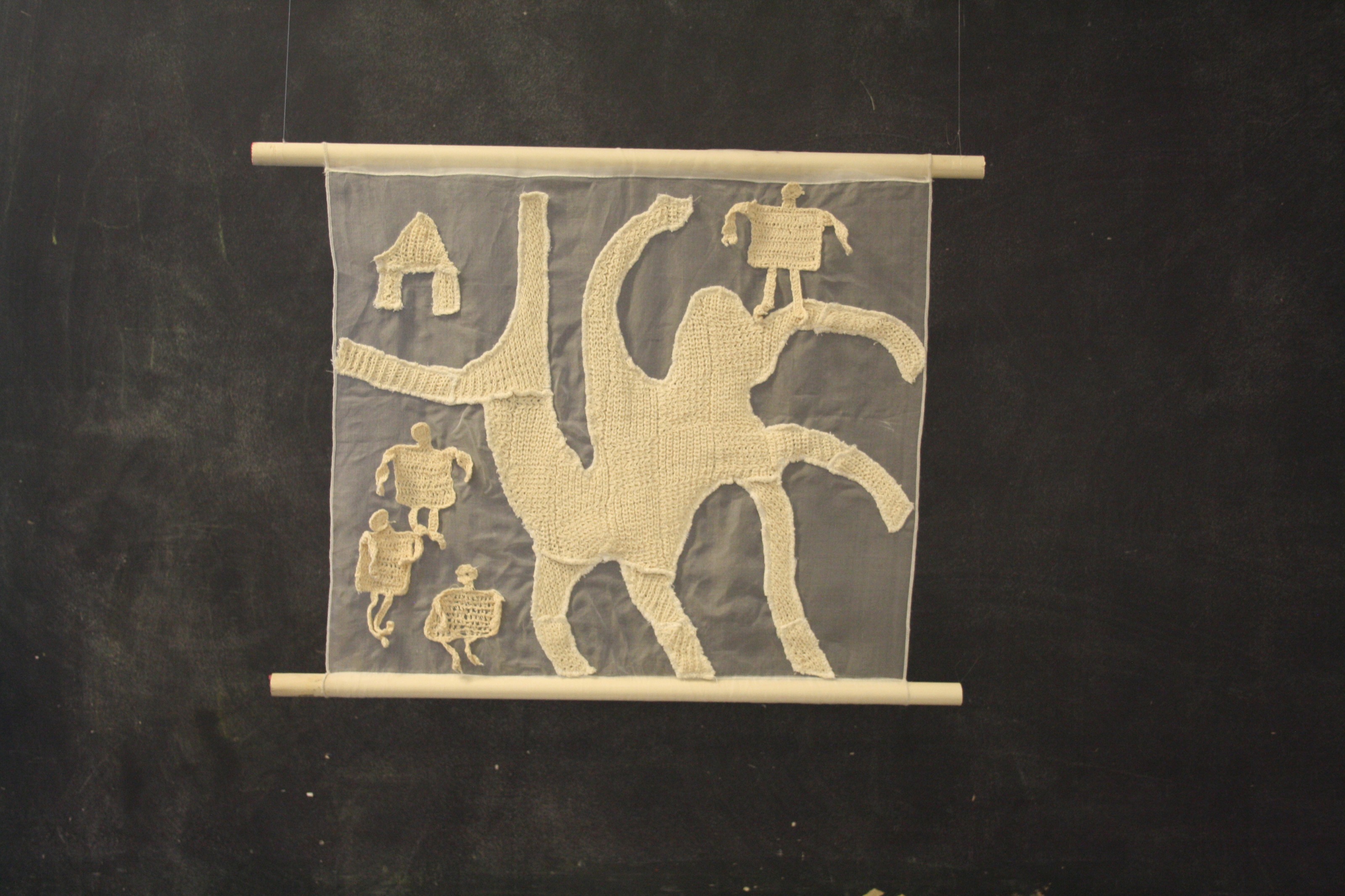 Recycled clothing, pantyhose, thread, wool, archival glue, plywood