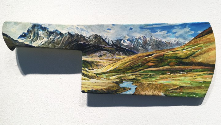 Hand-painted steel sword, iron and metal tile with enamel paint